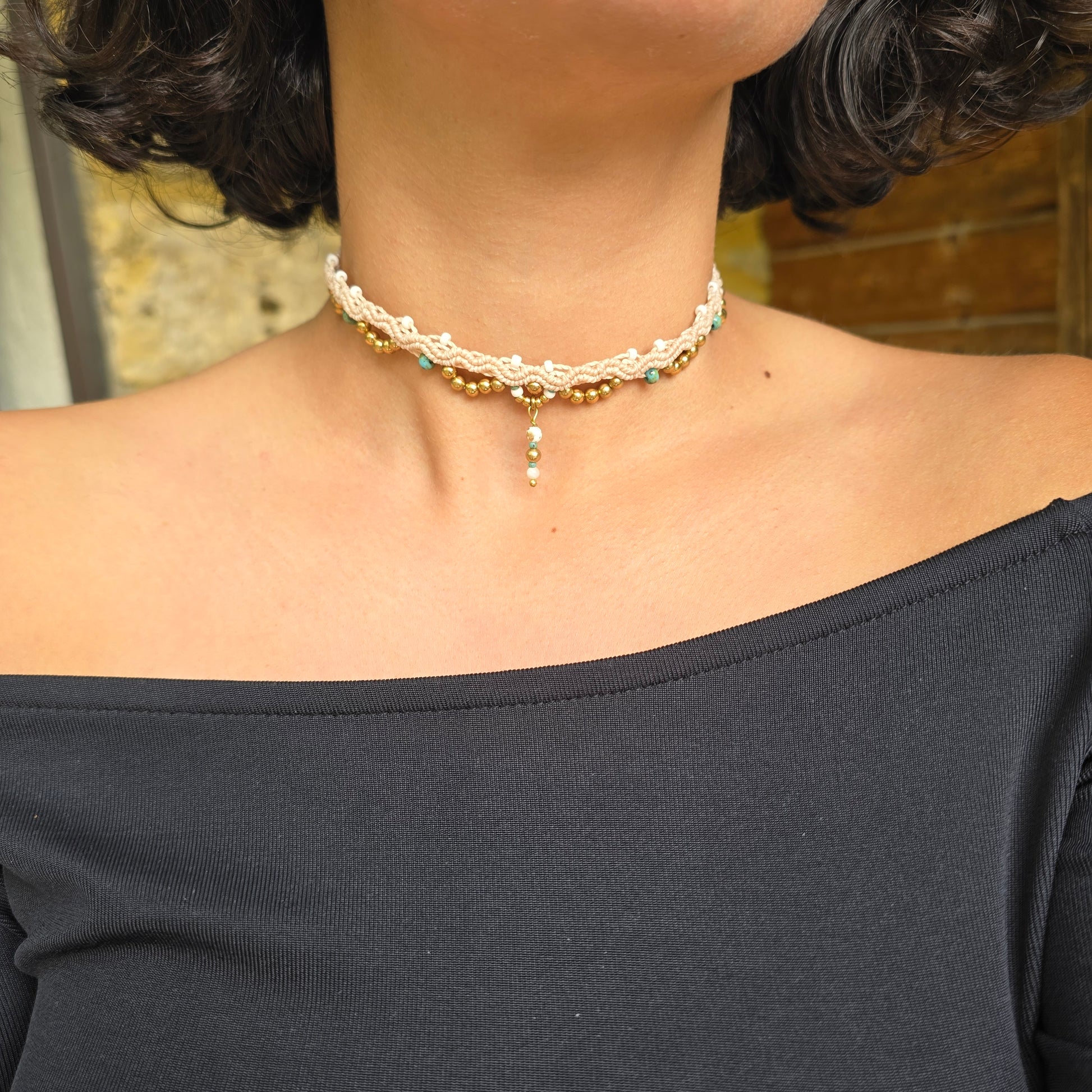- Beige crème, perles en laiton, perles rocaille, perle nacre, perles en verre Tchèque